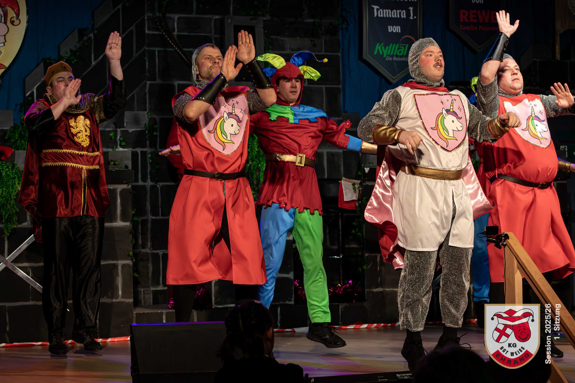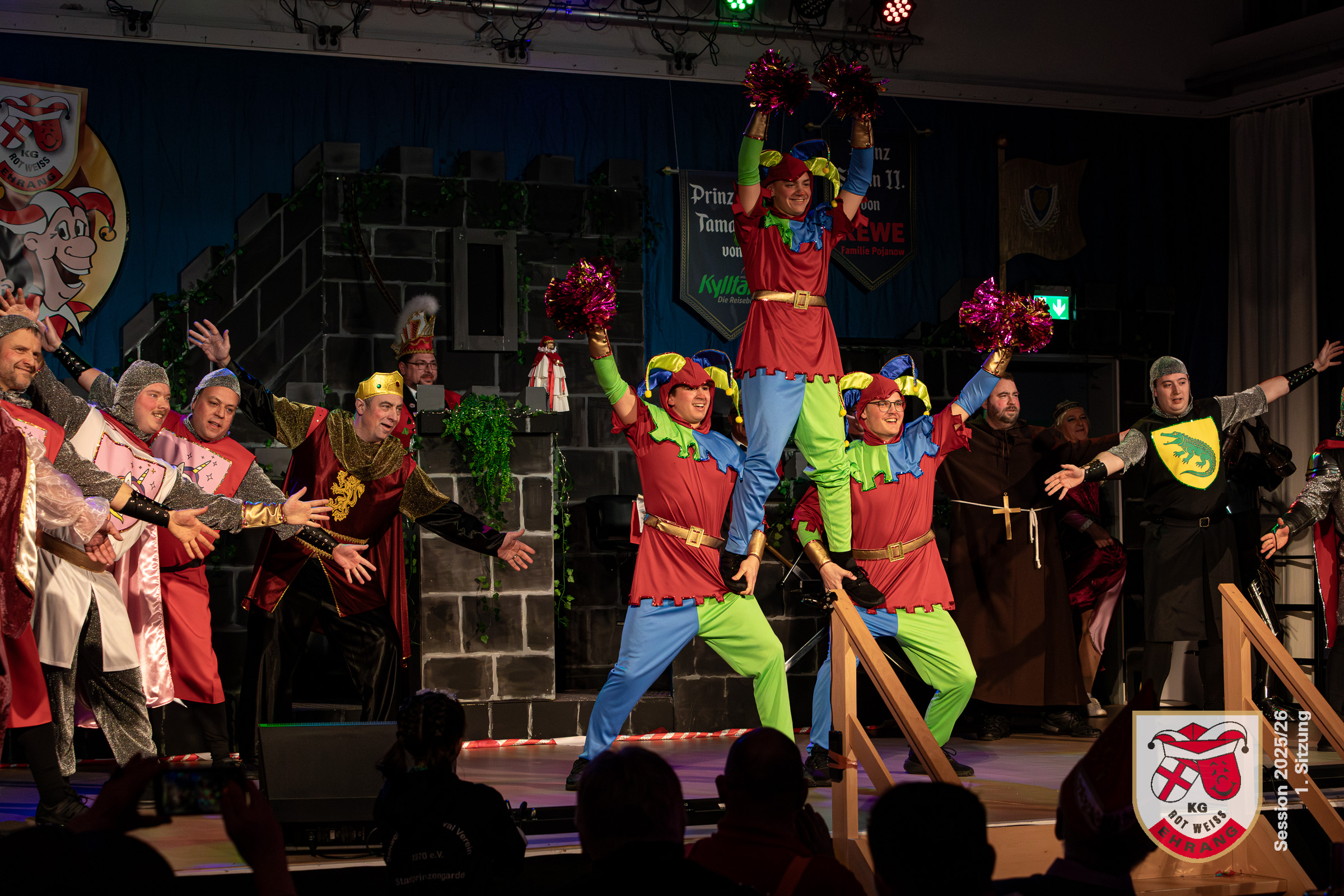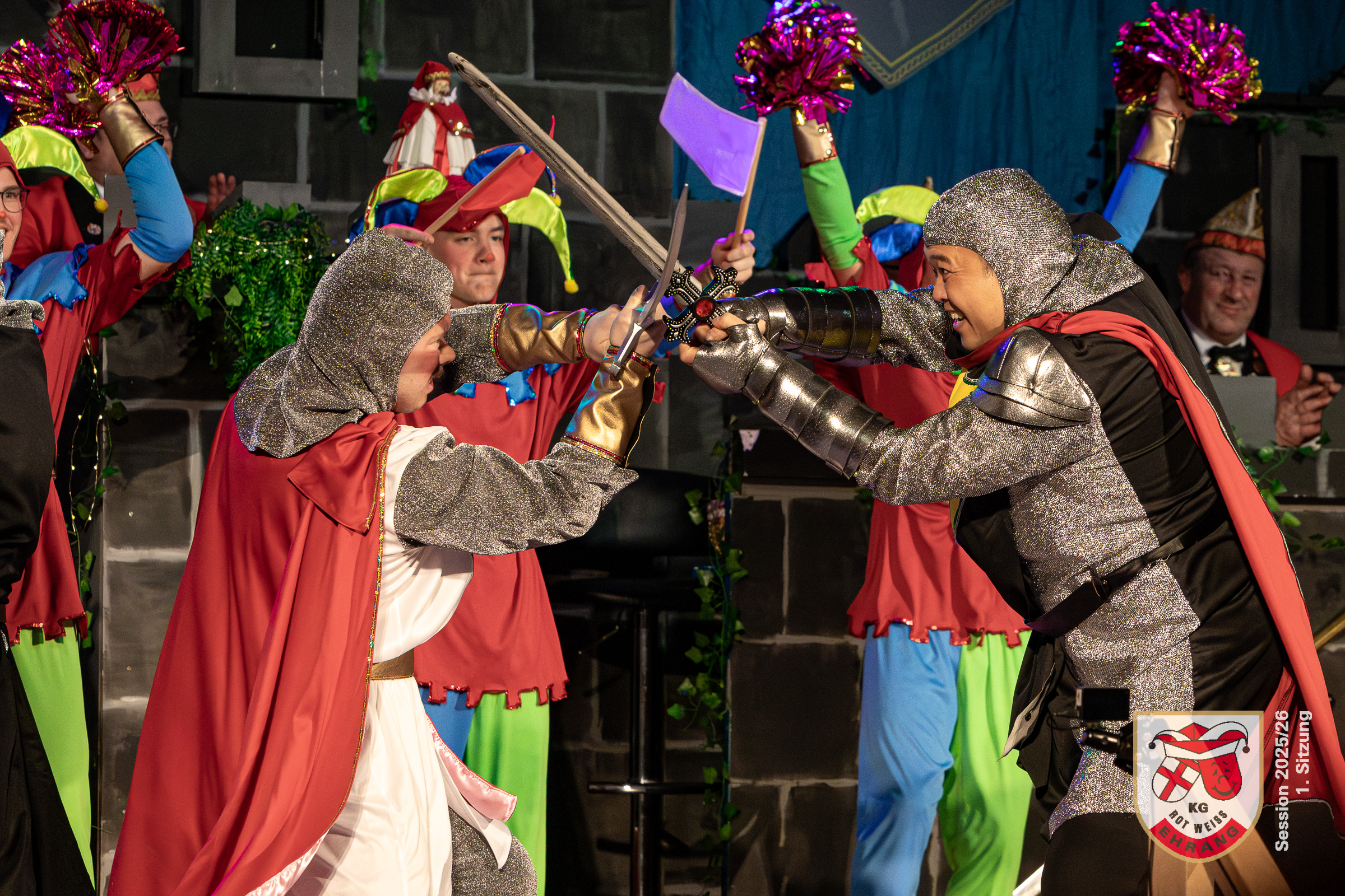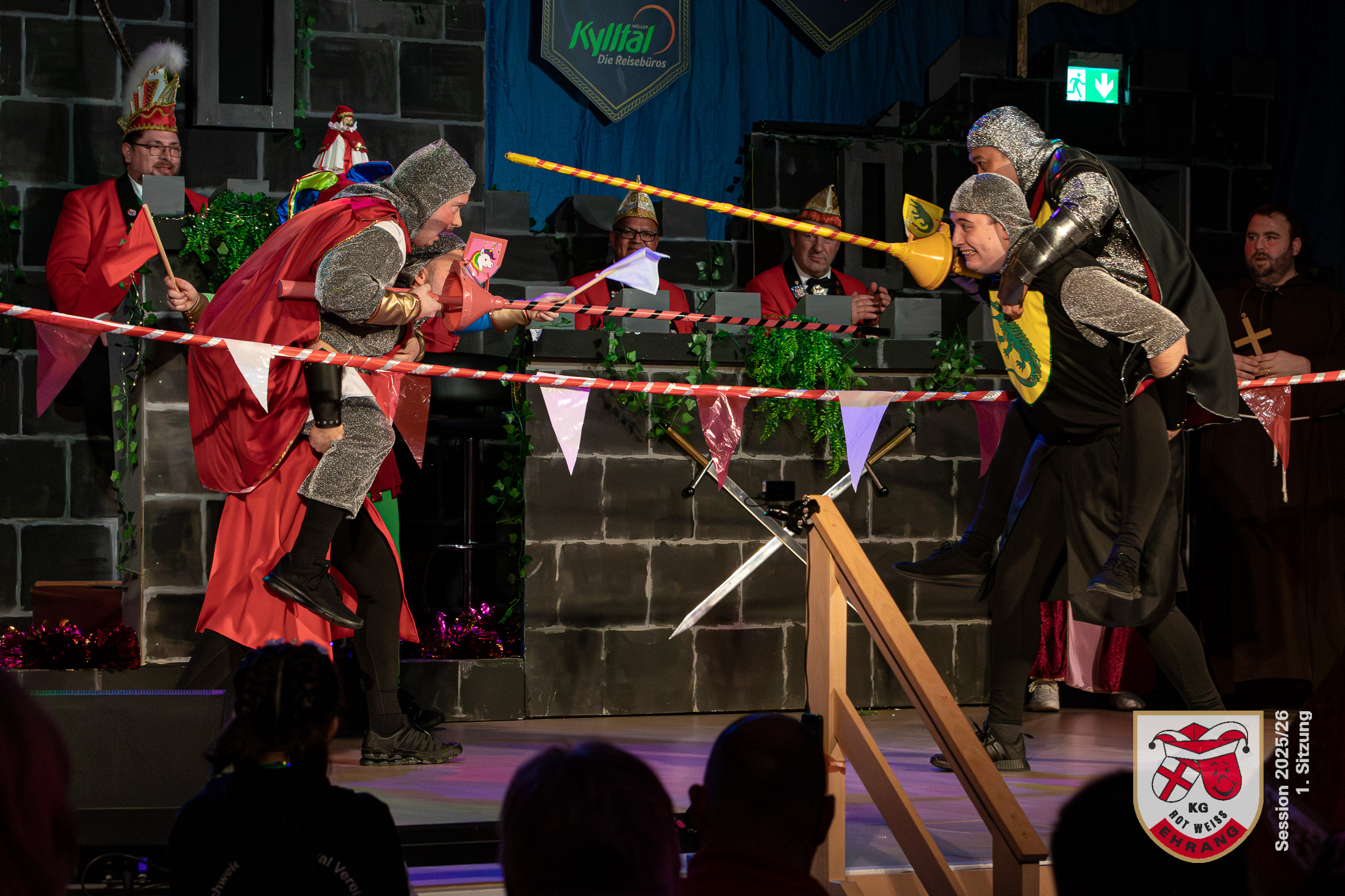 Keine Sitzung ohne »Die Roten Chaoten«. Das Männerballett der KG Rot-Weiß Ehrang hat sich getreu dem Sessionsmotto: »Ritter, Gaukler, Burgverwalter – Foasenicht im Mittelalter« ein ganz besonderes Ritterturnier ausgedacht. Edle Prinzessinnen, Hofnarren und tollkühne Ritter maßen sich im Lanzenstechen und Schwertkampf, schwangen das Bein und zeigten beeindruckende Hebefiguren.