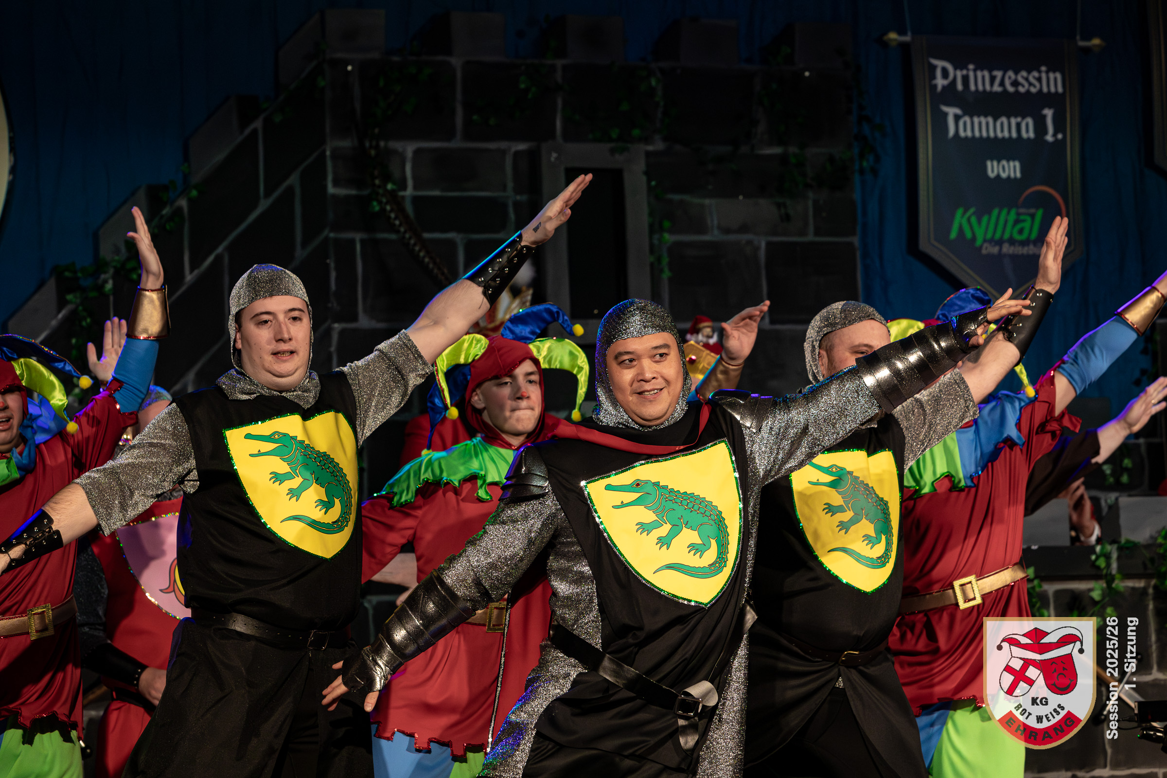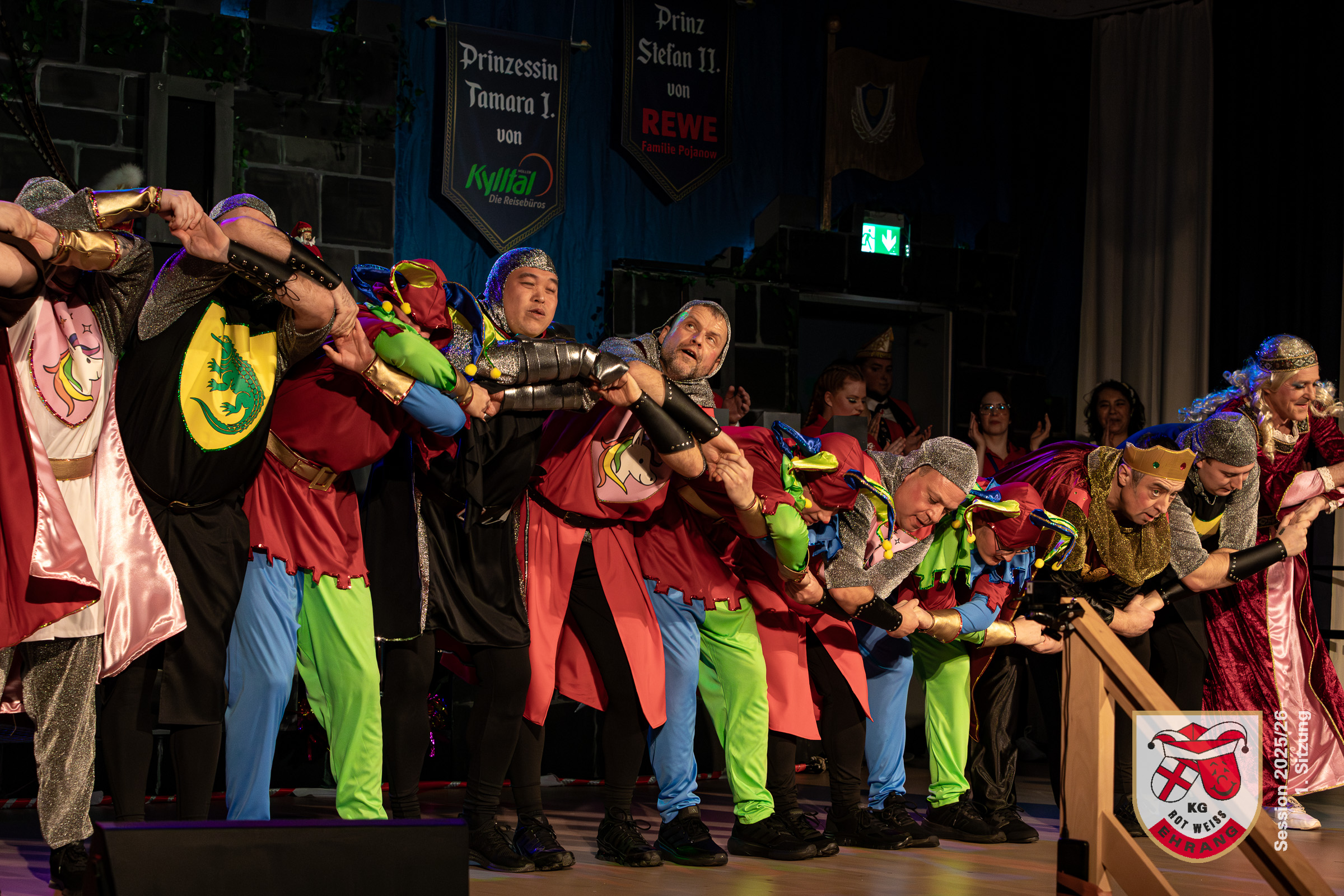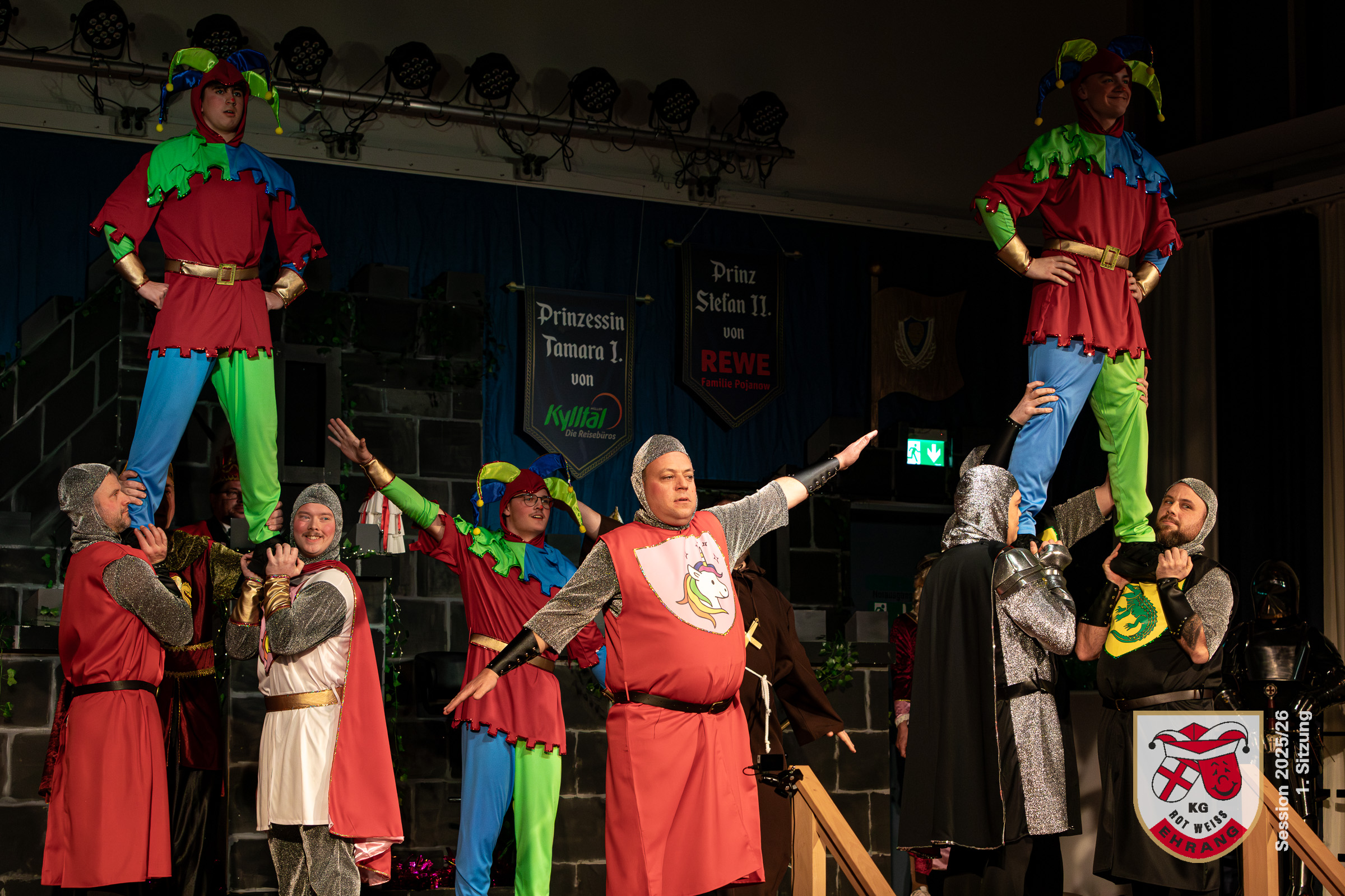 Keine Sitzung ohne »Die Roten Chaoten«. Das Männerballett der KG Rot-Weiß Ehrang hat sich getreu dem Sessionsmotto: »Ritter, Gaukler, Burgverwalter – Foasenicht im Mittelalter« ein ganz besonderes Ritterturnier ausgedacht. Edle Prinzessinnen, Hofnarren und tollkühne Ritter maßen sich im Lanzenstechen und Schwertkampf, schwangen das Bein und zeigten beeindruckende Hebefiguren.