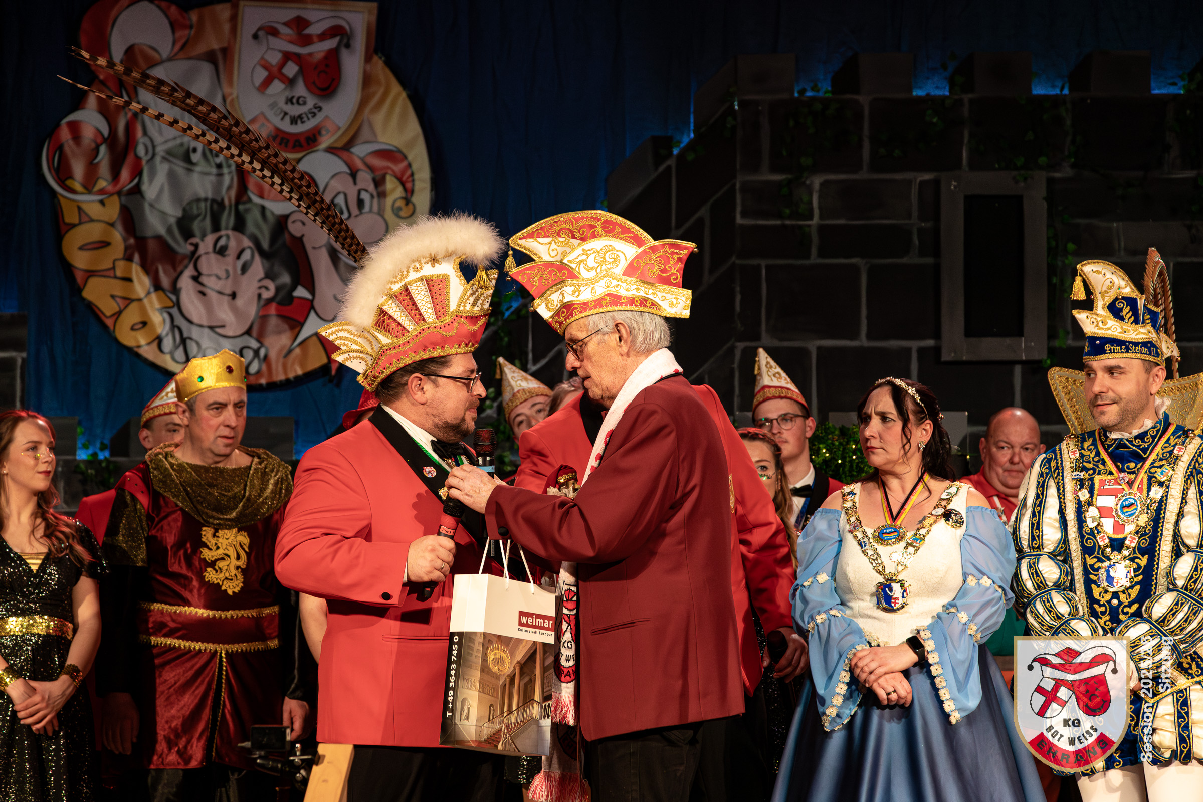 Aucxh im Finale gab es eine Überraschung für Präsident Stefan Thiel und die Rot-Weißen. Aus Triers Partnerstadt Weimar hatte sich eine Abordnung des befreundeten Karnevalvereins HWC Weimar heimlich unter die Besucher gemischt. Das Präsidium fühlte sich durch den Besuch sichtlich geehrt. HWC Ehrenpräsident Peter Falk überreichte noch einige Geschenke aus Weimar, bevor die Sitzung offiziell endete.