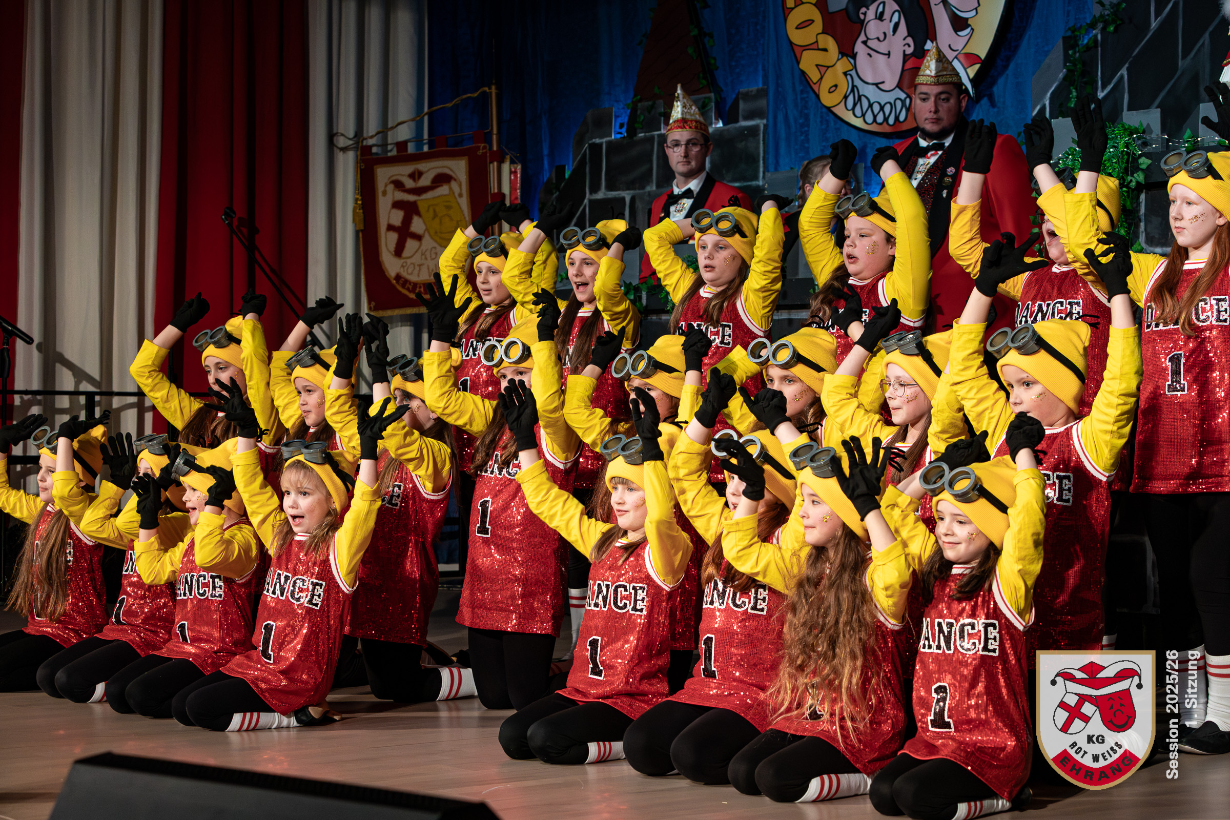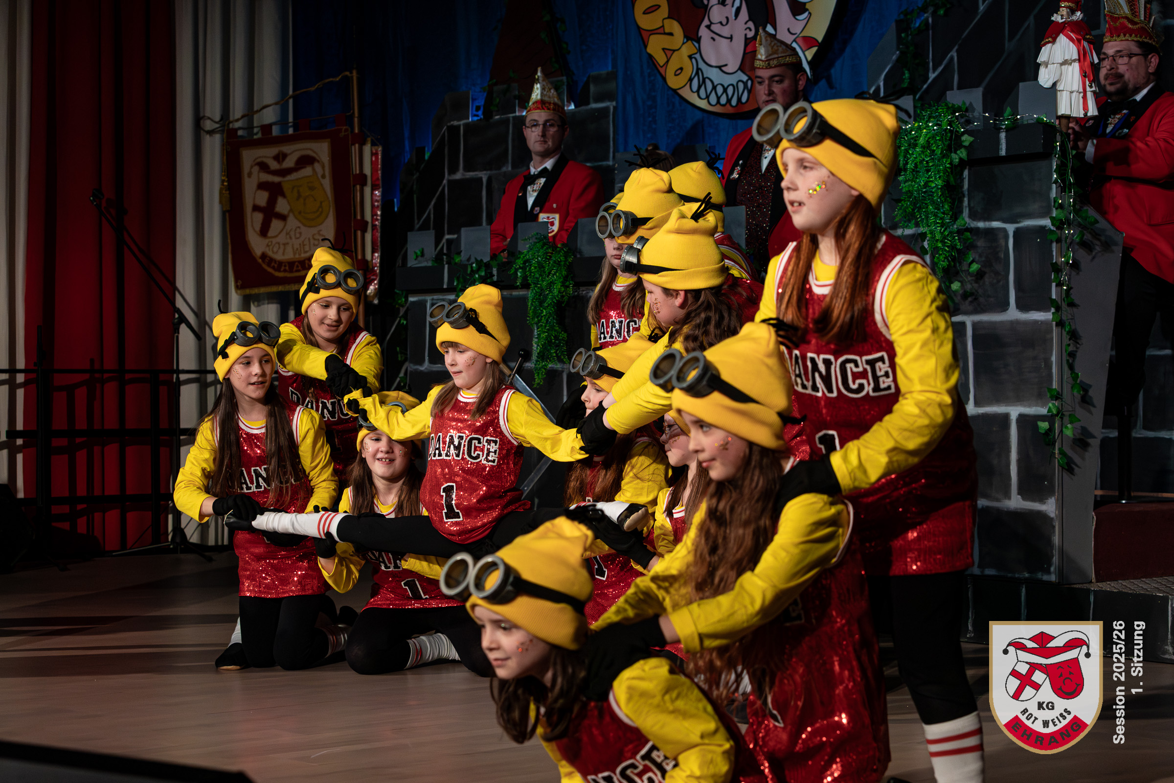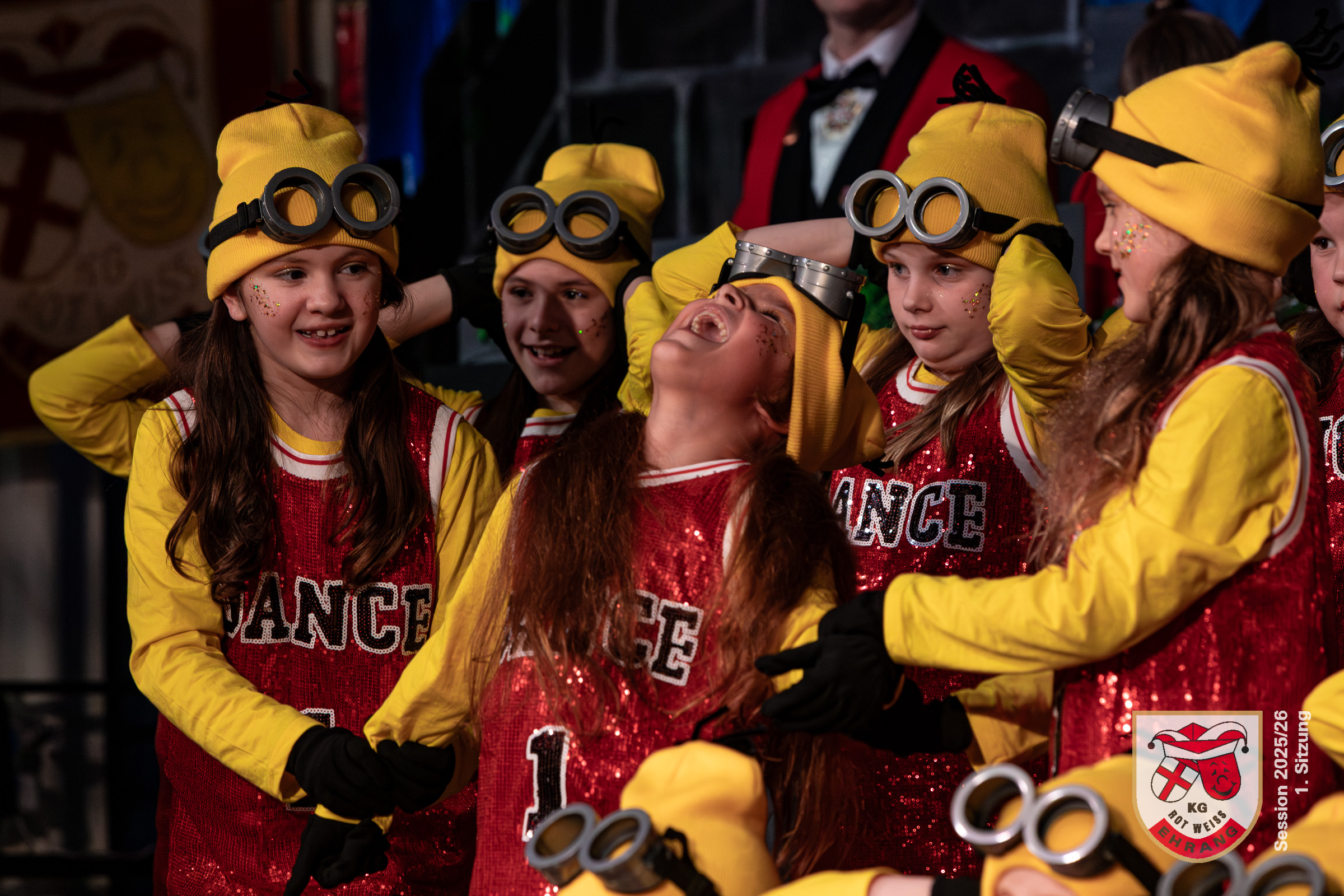 Die ersten Programmpunkte bildeten die Showtänze des Vereinsnachwuchses. Bei den Zappelzwergen und anschließend bei den Zappelinis beeindruckten die Kinder im Alter von drei bis sechs Jahren das sichtlich gerührte Publikum mit Ihren Tänzen. Dann war die Kindergarde an der Reihe. Für ihren Showtanz eroberten die 22 gelben »Minions« mit ihren roten Glitzershirts die Bühne und begeisterteten ebenfalls die Zuschauer.